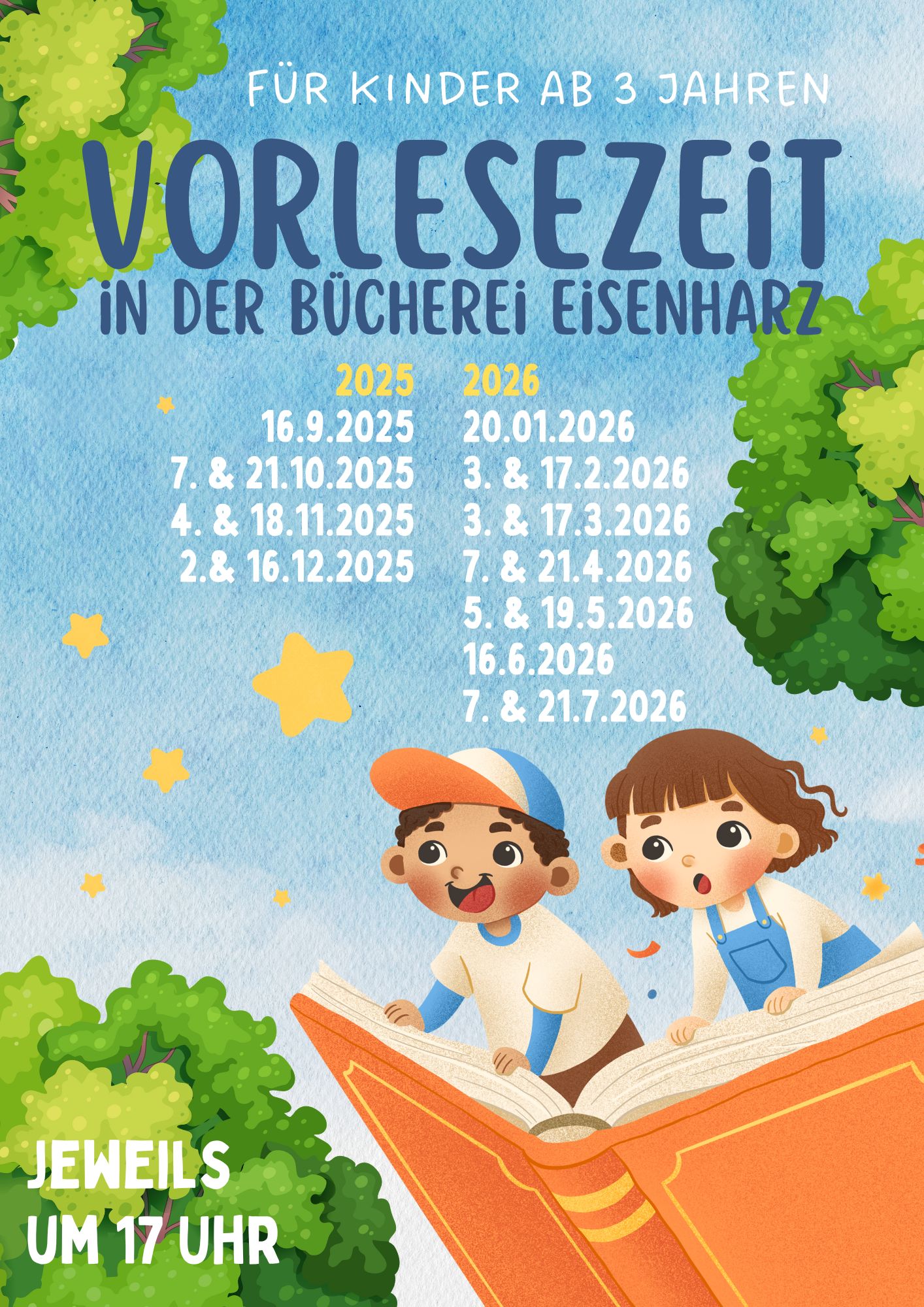 Fast jeden ersten und dritten Dienstag im Monat gibt es um 17 Uhr spannende Geschichten für Kinder ab 3 Jahren zu hören. Auch hier gibt es einen Vorlesepass, bei dem Du nach 10 Besuchen ein kleines Geschenk erhälst.